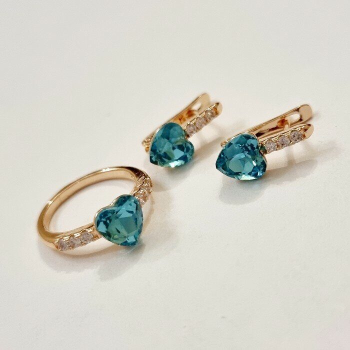 Комплект ювелирная бижутерия, серьги и кольцо позолота, камни голубые, р-р 17, 54209 арт.847.844