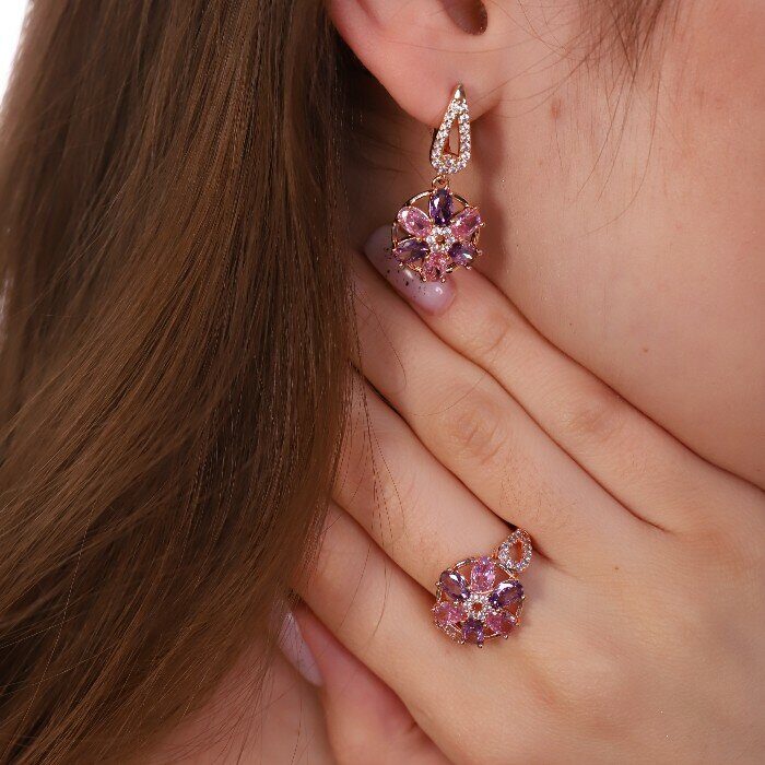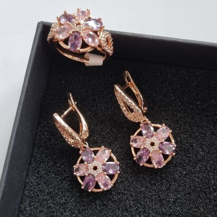 Комплект ювелирная бижутерия, серьги и кольцо позолота, камни розово-фиолетового цвета, р-р 19, 542809 арт.847.837