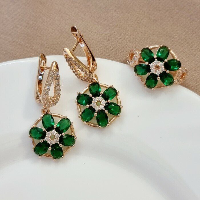 Комплект ювелирная бижутерия, серьги и кольцо позолота, камни зеленого цвета, р-р 18, 542809 арт.847.796