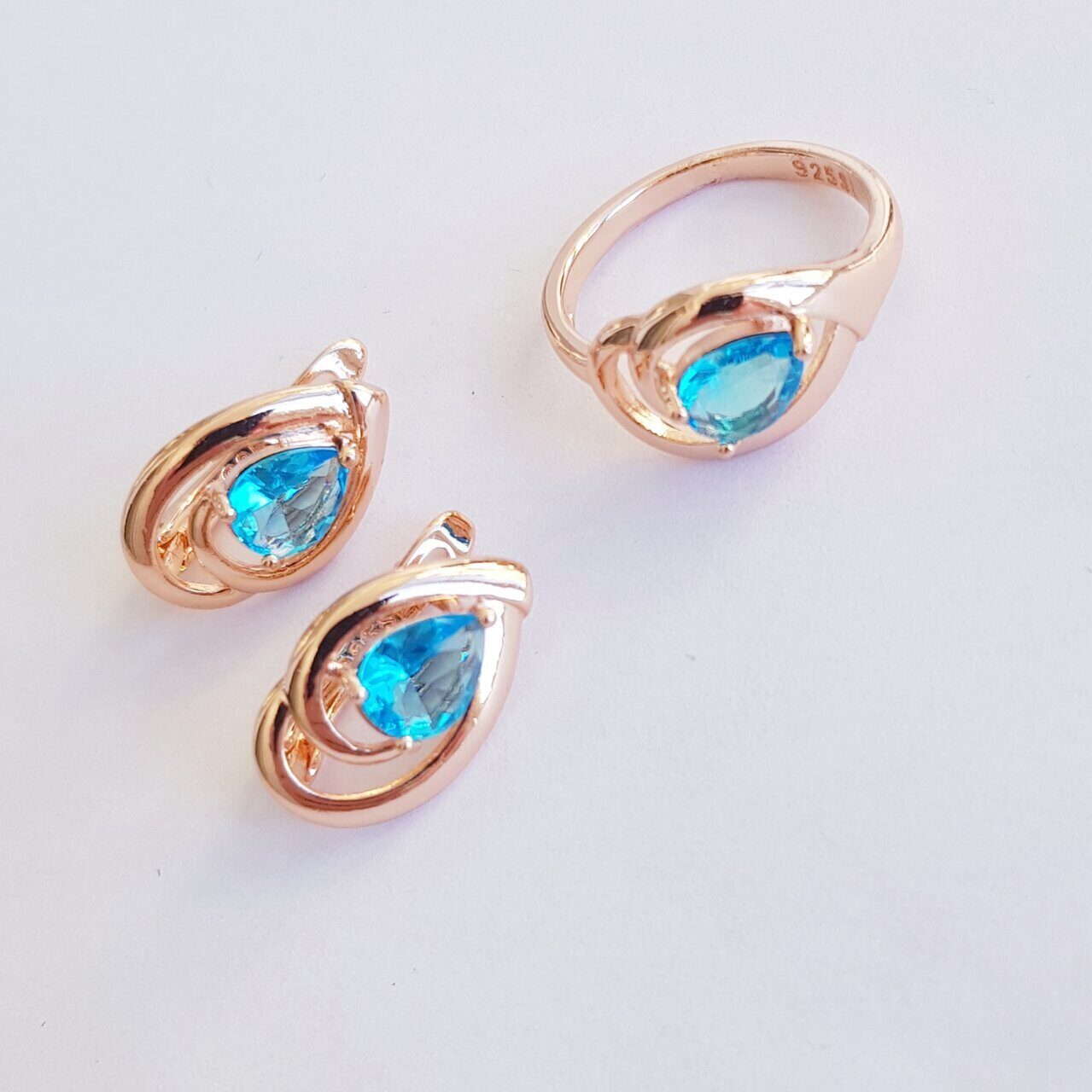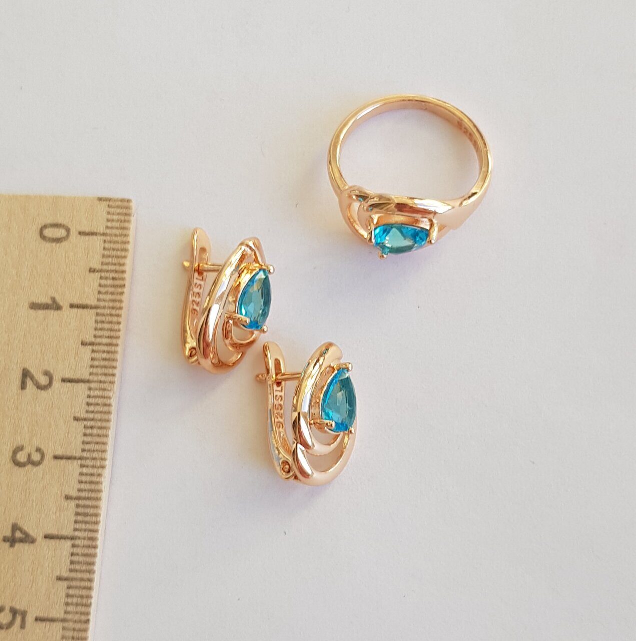 Комплект коллекция "Дубай", покрытие позолота с камнем, цвет голубой серьги, кольцо р-р 17, Е6163, арт.747.971