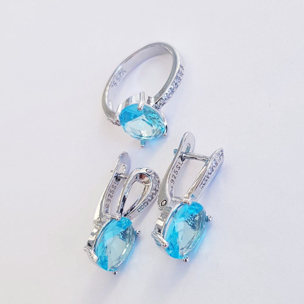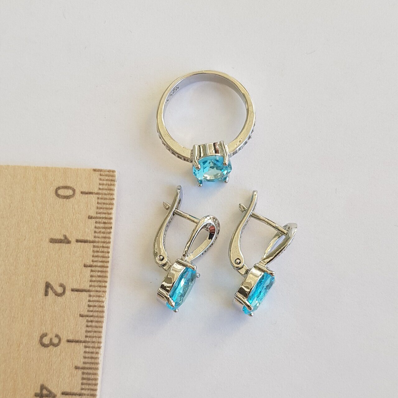 Комплект коллекция "Дубай", покрытие посеребрение с камнем, цвет голубой, серьги, кольцо р-р 17, Е2203, арт.747.899