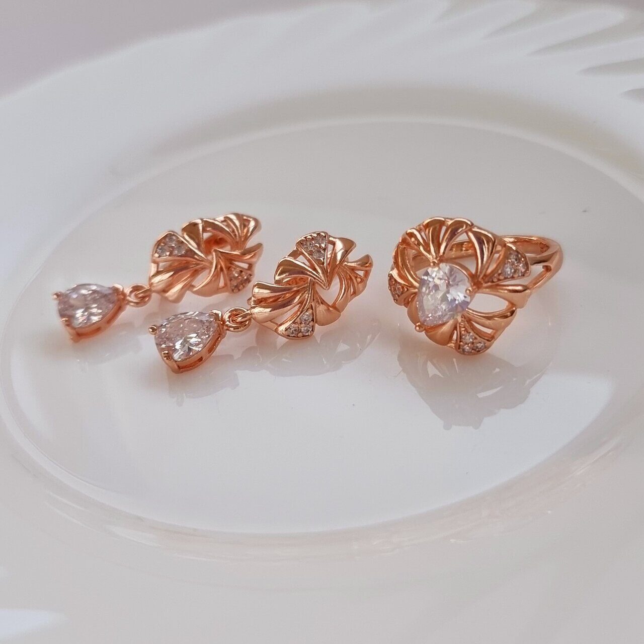 Описание Размер кольца: 19. Размер серёжек: 3*1,2 см. Замок: английский. Материал: металл, кристалл. Вес: 9 гр.