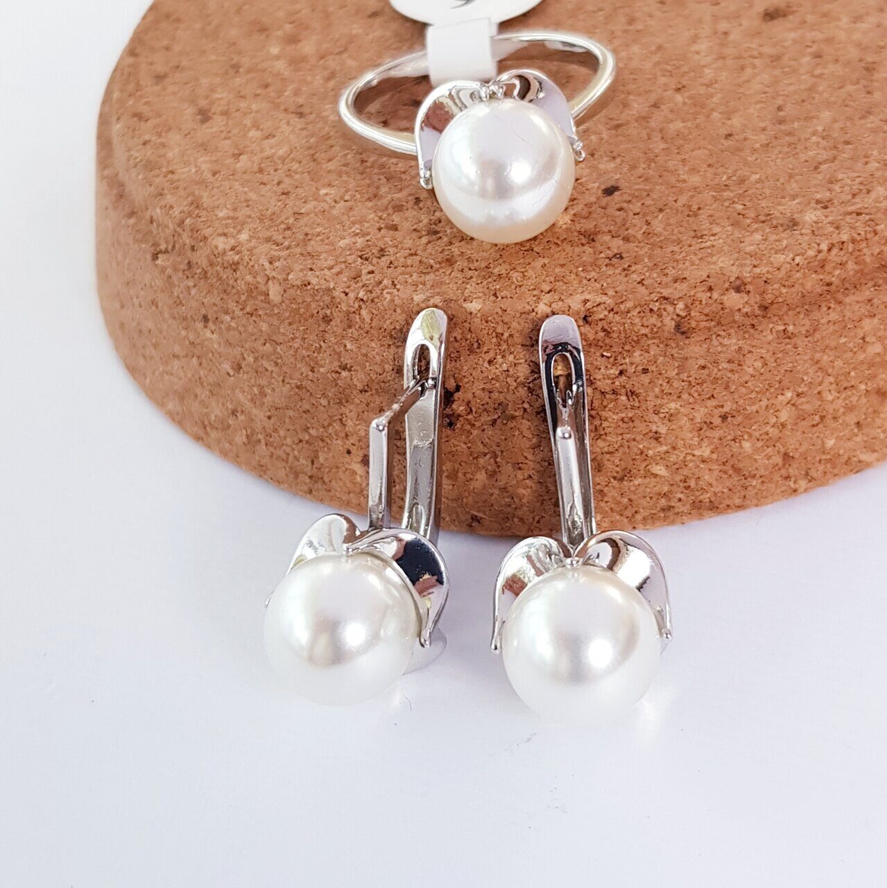 Описание Размер кольца: 18. Размер серёжек: 2*1 см. Замок: английский. Материал: металл, иск. жемчуг. Вес: 8 гр.