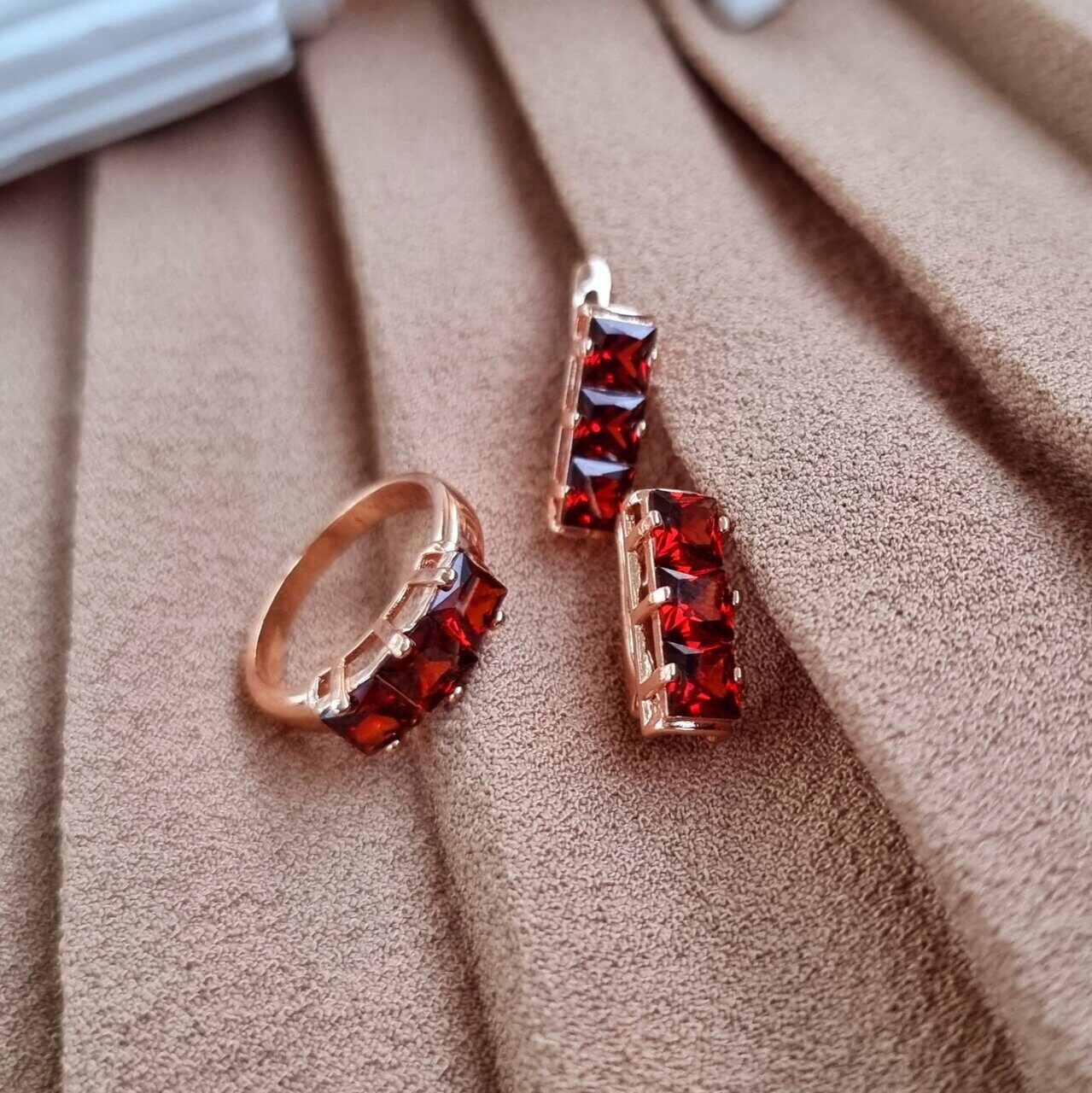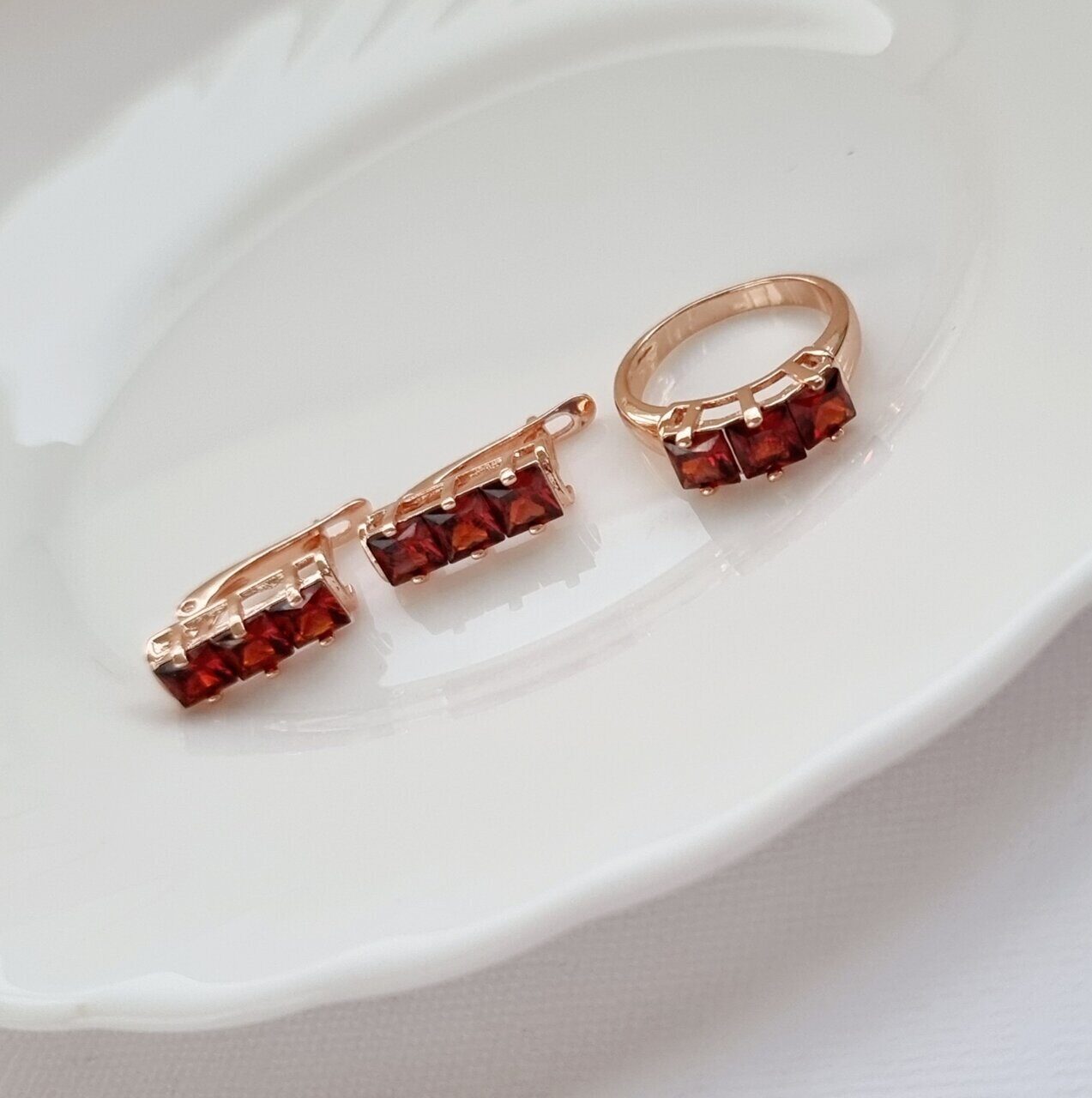 Комплект коллекция "Дубай", покрытие позолота с фианитами, цвет красный,серьги, кольцо р-р 19, А121607, арт.747.319