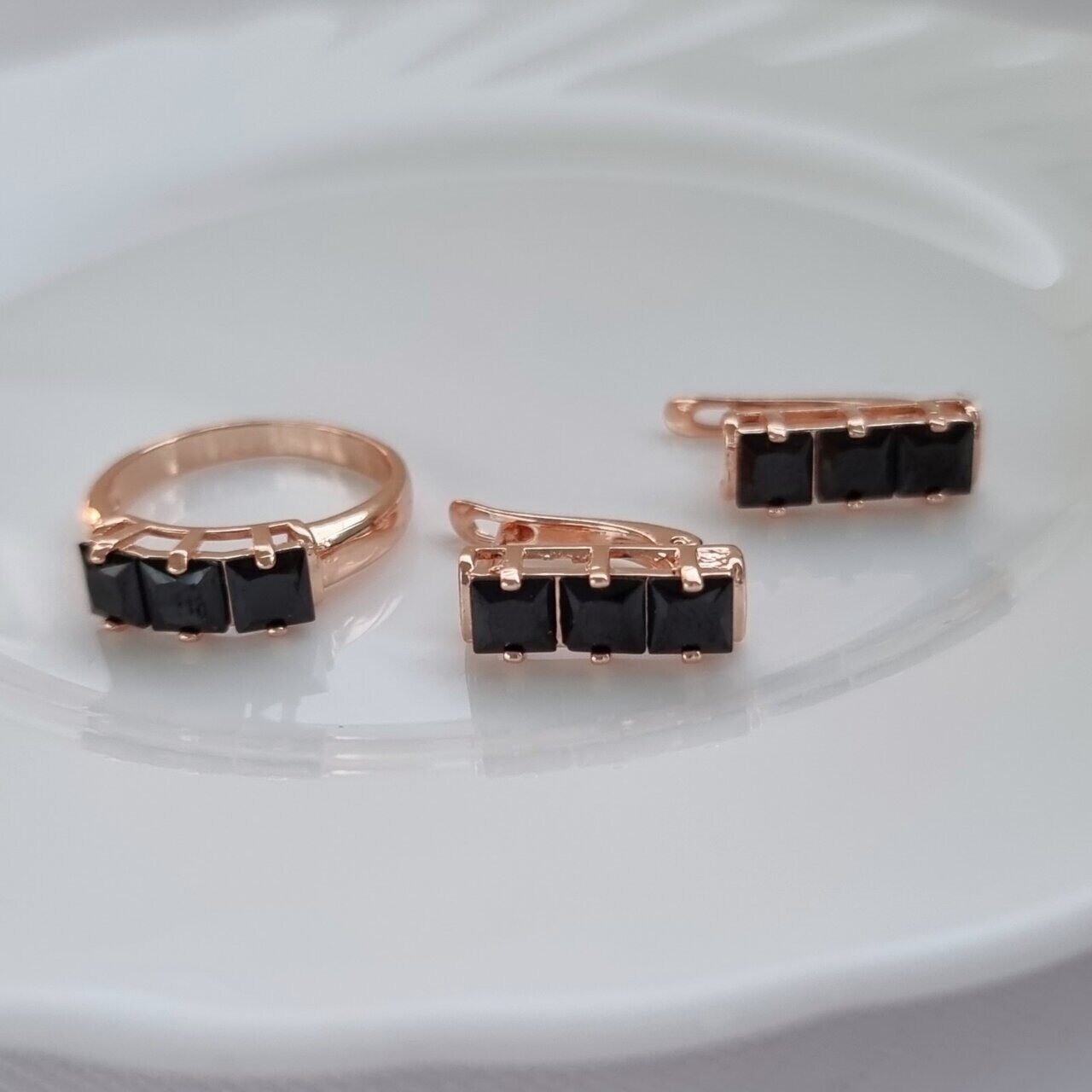 Комплект коллекция "Дубай", покрытие позолота с фианитами, цвет черный, серьги, кольцо р-р 17 , А121607, арт.747.315
