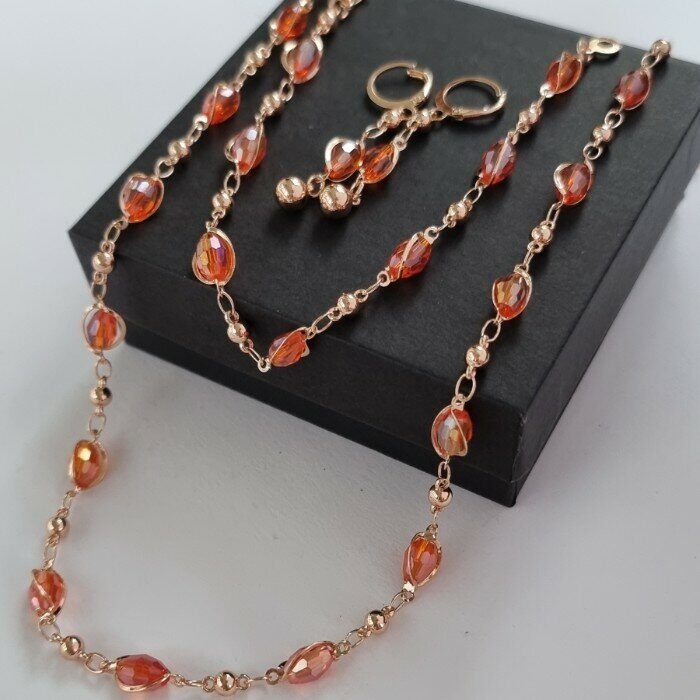 Комплект: ожерелье, серьги и браслет, покрытие: дубайское золото, цвет камней: оранжевый, Уценка, арт.08.1411