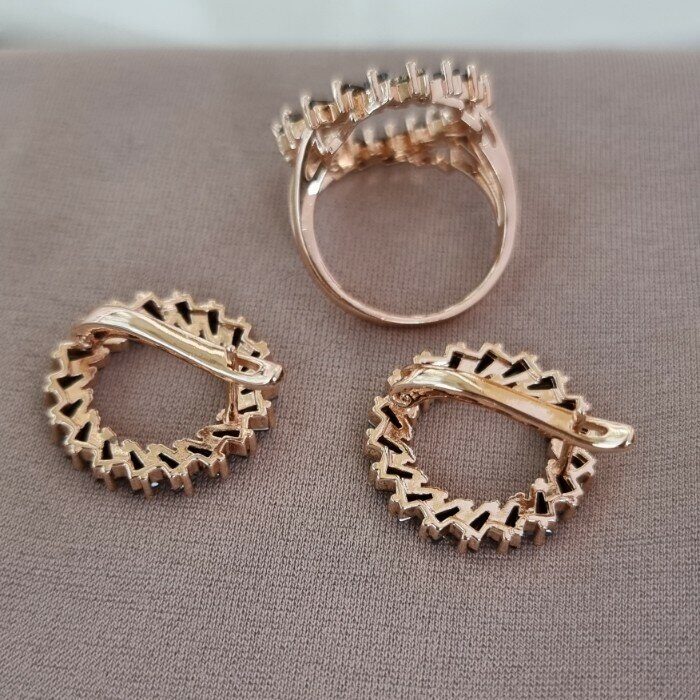 Описание Уценка! Нет одного камня в одной серьге. Размер кольца: 19. Размер серёжек: 2*2 см. Замок: английский. Материал: бижутерный сплав, цирконы. Вес: 12 гр.