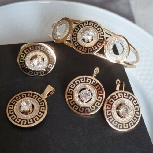 Описание Уценка! В комплекте браслет, серьги и кулон. Нет кольца. Размер серьги: 2,7*2 см, размер кулона: 3*2 см, диаметр браслета: 6,5 см. Замок: английский. Вес комплекта: 31 гр. Цепочка в комплект не входит!