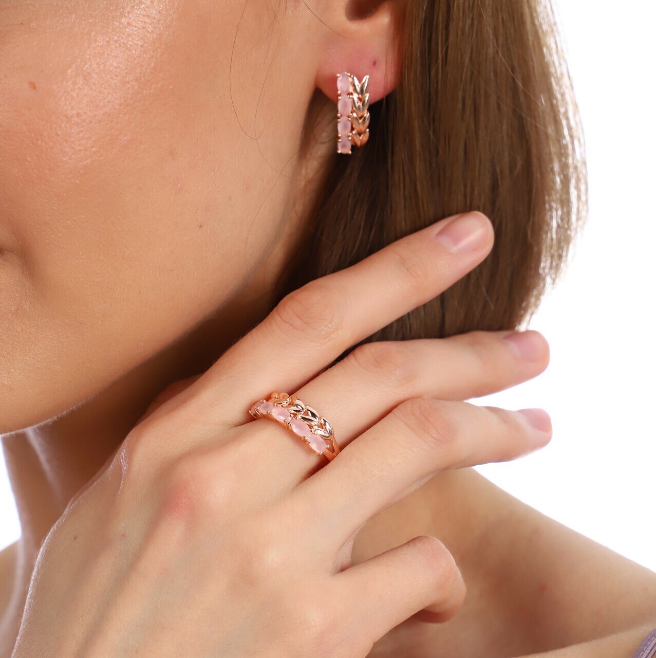 Комплект коллекция "Дубай", покрытие позолота с камнем, цвет матово-розовый, серьги, кольцо р-р 19, Е8183, арт.747.678