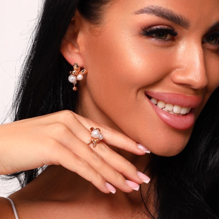 Комплект ювелирной бижутерии Дубайское золото, покрытие: позолота, серьги и кольцо 17 р, вставка: искусственный жемчуг, Уценка, арт.08.2141