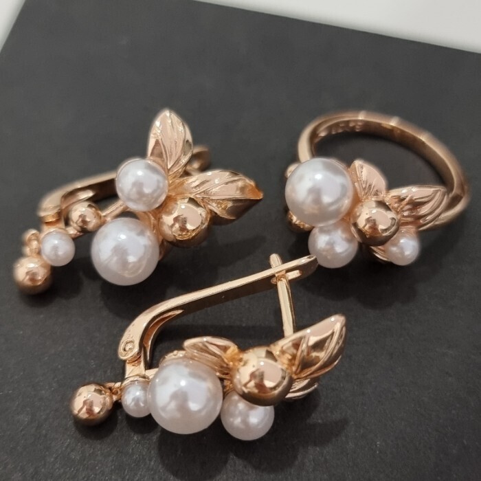 Комплект ювелирной бижутерии Дубайское золото, покрытие: позолота, серьги и кольцо 18 р, вставка: искусственный жемчуг, Уценка,арт.08.2332
