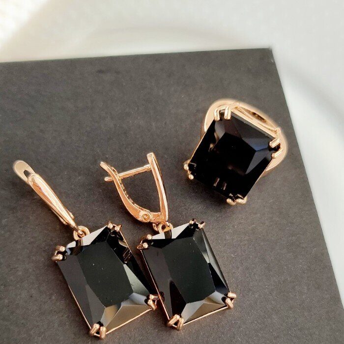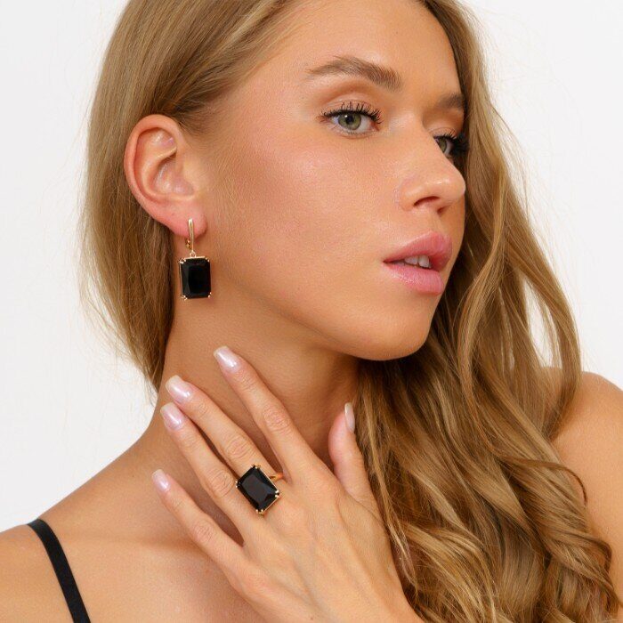 Комплект ювелирной бижутерии Дубайское золото с крупным камнем, серьги и кольцо 19 р, покрытие позолота, цвет: черный,Уценка, арт.08.1795