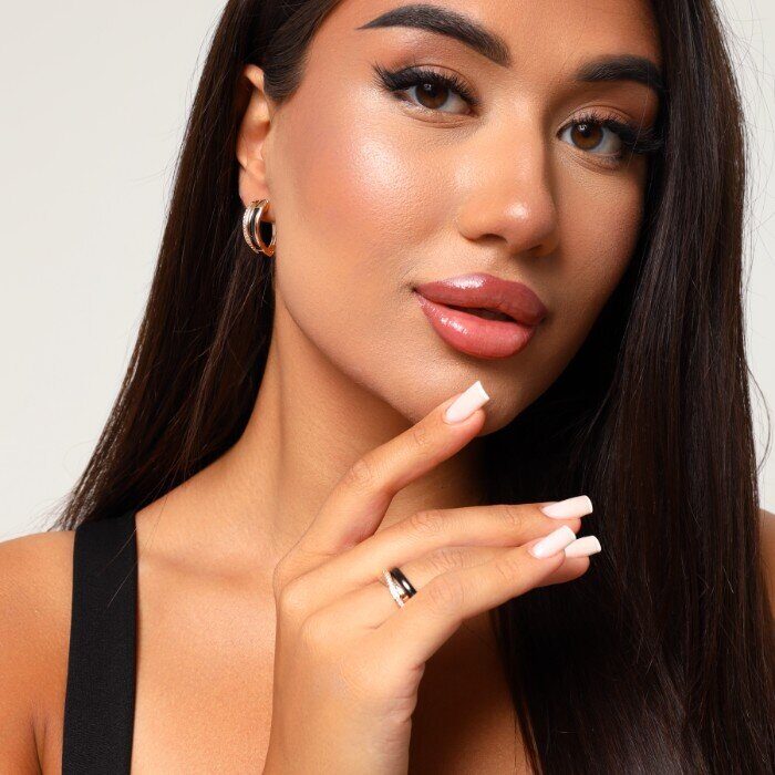 Комплект ювелирной бижутерии Дубайское золото: серьги и два раздельных кольца, с покрытием позолотой, вставка: фианиты и черная керамика, р-р 18,Уценка, арт.08.1547