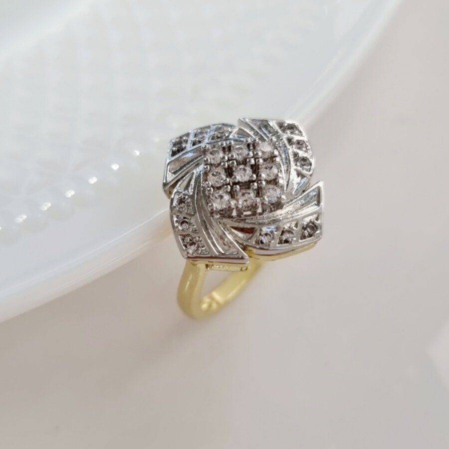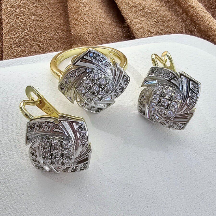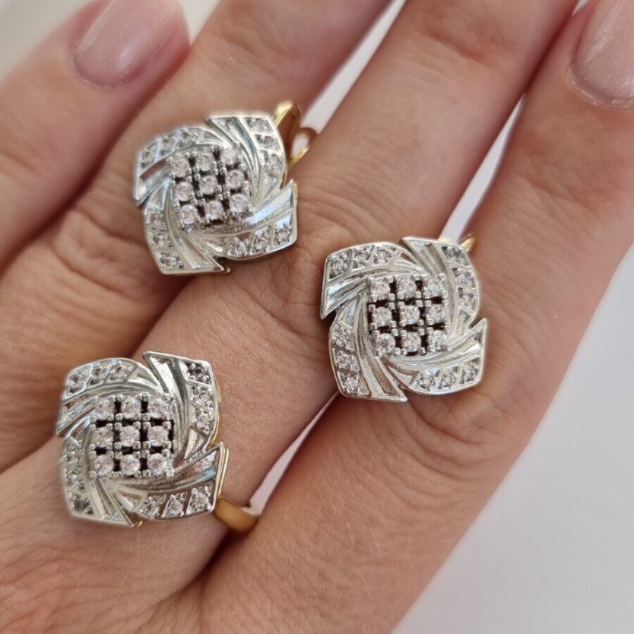 Комплект ювелирной бижутерии Итальянское золото (покрытие желтое 14к), серьги и кольцо, вставка: фианиты, р-р 20, 0125, Уценка, арт. 08.2368