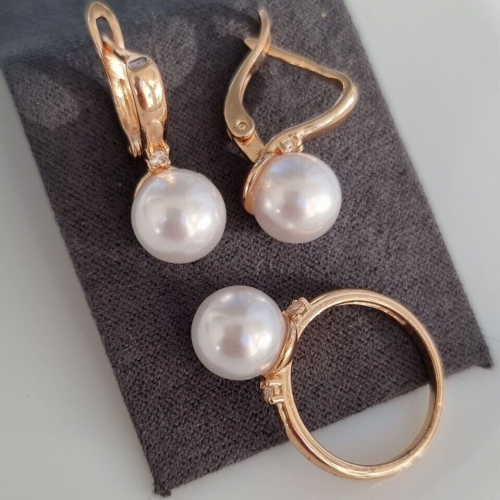 Комплект ювелирной бижутерии Дубайское золото серьги и кольцо, покрытие позолота, вставка: иск.жемчуг, р-р 18, 070, арт. 216.004-18
