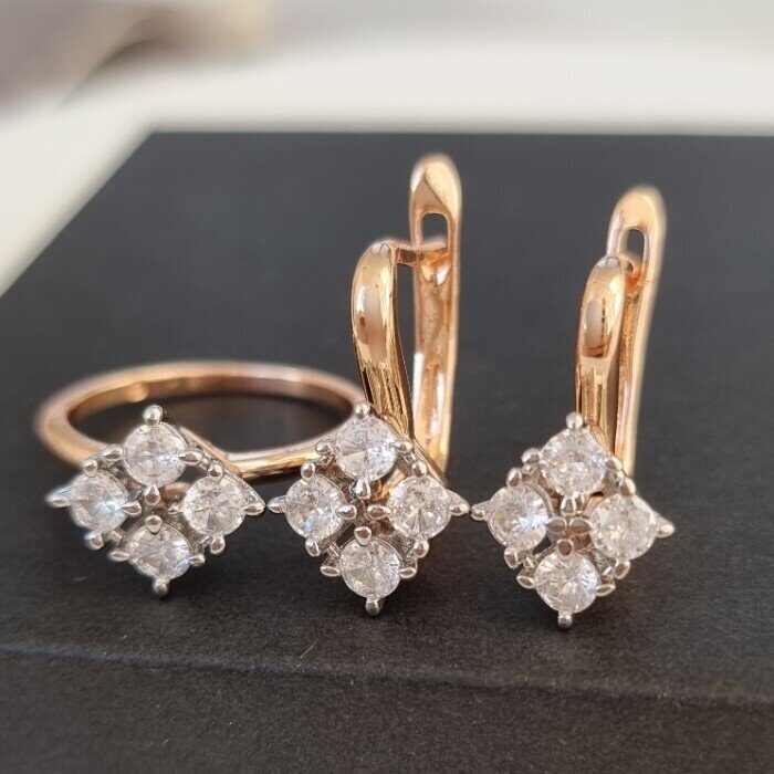 Комплект ювелирной бижутерии Дубайское золото, серьги и кольцо 19 р, двойное покрытие позолота и посеребрение, вставка:фианиты, цвет: прозрачный, арт.213.024-19