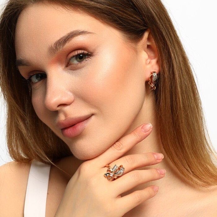 Комплект ювелирной бижутерии Дубайское золото, серьги и кольцо 19 р, покрытие позолота, вставка: фианиты, цвет: прозрачный, Уценка, арт.08.2364