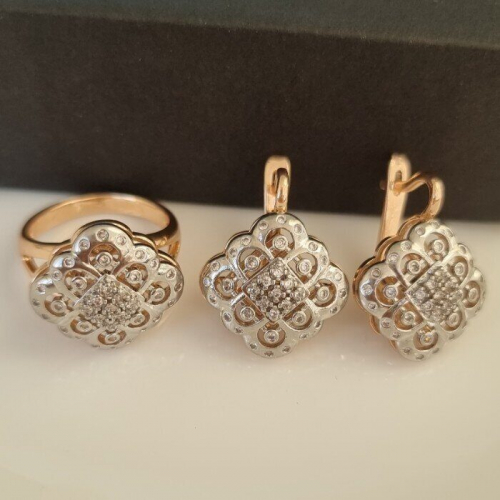 Комплект ювелирной бижутерии Дубайское золото , серьги и кольцо 20р, двойное покрытие позолота и посеребрение, вставка:фианиты, цвет: прозрачный, арт. 213.034-20