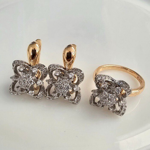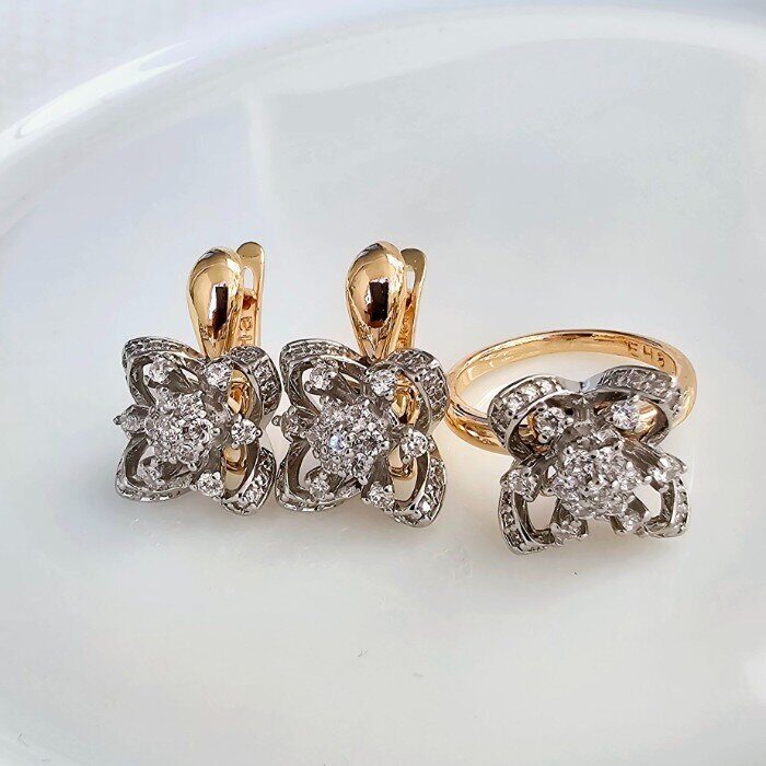 Комплект ювелирной бижутерии Дубайское золото, серьги и кольцо покрытие позолота 17 р и вставка из посеребрения, цвет: прозрачный, Уценка, арт. 08.1916