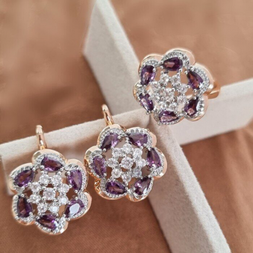Комплект ювелирной бижутерии Дубайское золото серьги и кольцо, покрытие позолота, вставка: фианиты, цвет: сиреневый и прозрачный, р-р 19, 0119, Уценка, арт.08.1532