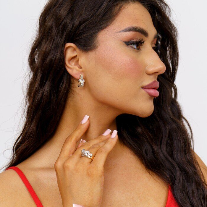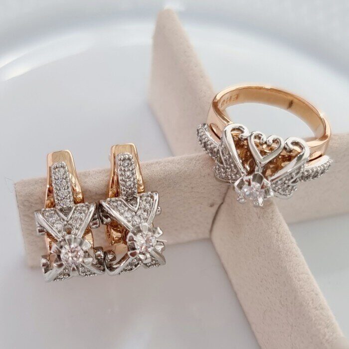 Комплект ювелирной бижутерии Дубайское золото серьги и кольцо, с двойным покрытием позолотой и посеребрением, вставка: фианиты, р-р 19, 0119, Уценка, арт.08.1635