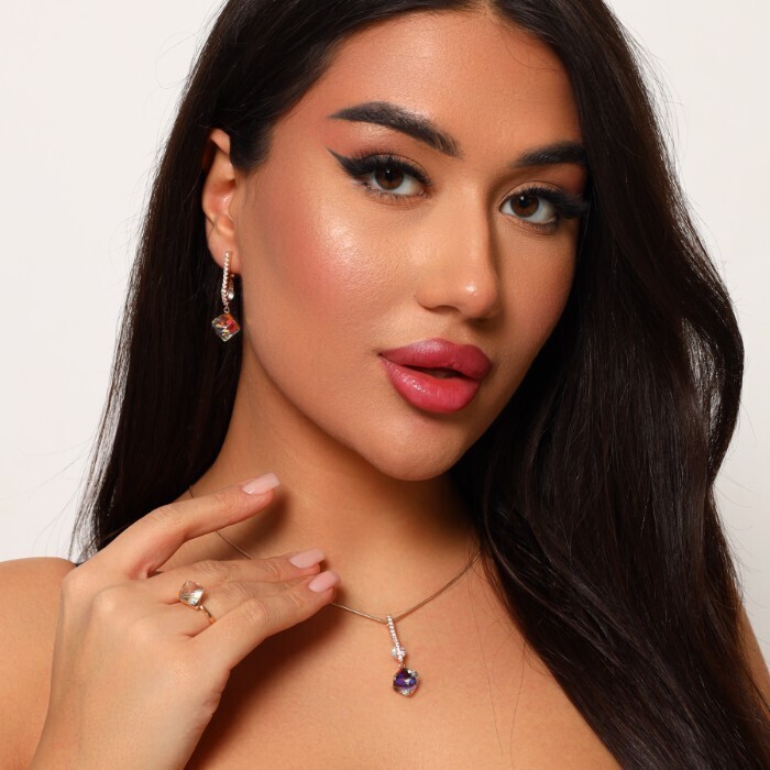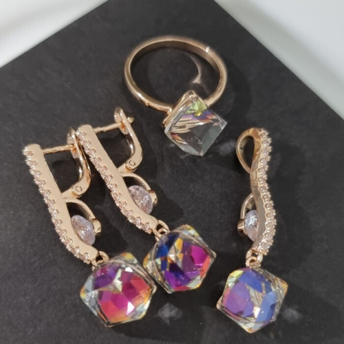 Комплект ювелирной бижутерии Дубайское золото серьги, кулон и кольцо 18 р в стиле геометрии, покрытие: позолота, вставка: фианит, цвет: хамелелон, Уценка, арт.08.2462