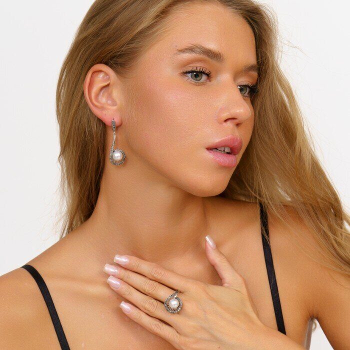Комплект ювелирной бижутерии Дубайское золото, серьги висячие с жемчугом и кольцо 19 р, покрытие посеребрение, цвет: перламутровый, черный, Уценка, арт. 08.1777