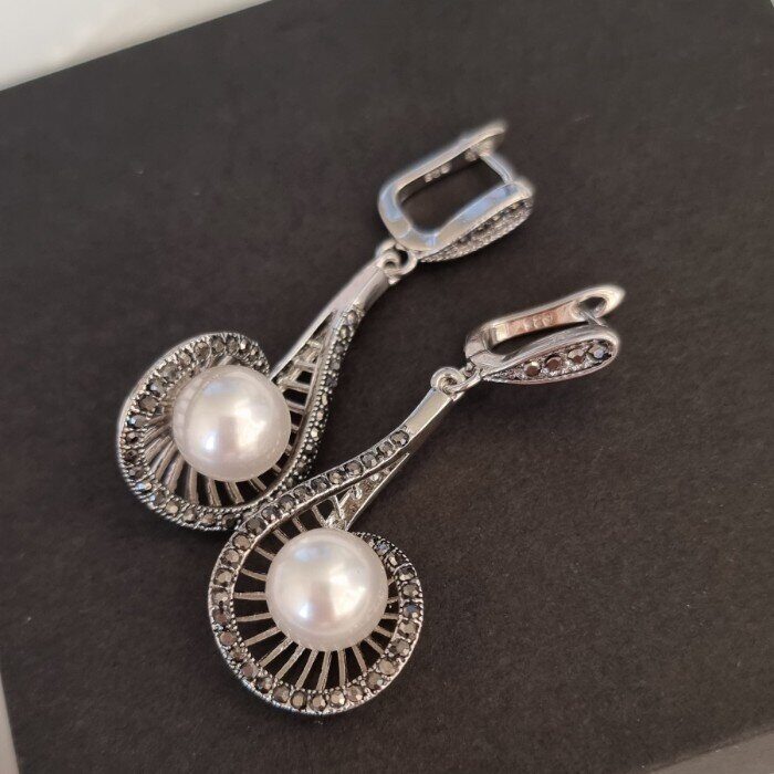 Описание Уценка! Небольшие потертости на поверхности жемчужин, нескольуо мутных страз.Размер: серьги - 4,3*1,7 см. Замок: английский. Материал: бижутерный сплав. Вес: 13 гр.
