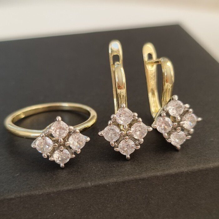 Комплект ювелирной бижутерии Итальянское золото (покрытие желтое 14к), серьги и кольцо 17 р, двойное покрытие позолота и посеребрение, вставка:фианиты, цвет: прозрачный, арт.213.023-17