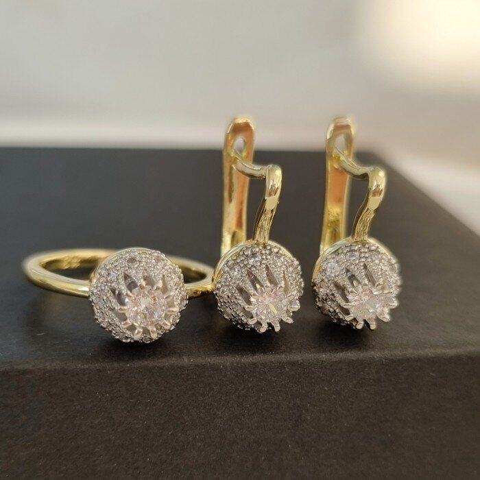 Комплект ювелирной бижутерии Итальянское золото (покрытие желтое 14к), серьги и кольцо 19 р, двойное покрытие позолота и посеребрение, вставка:фианиты, цвет: прозрачный, арт.213.025-19