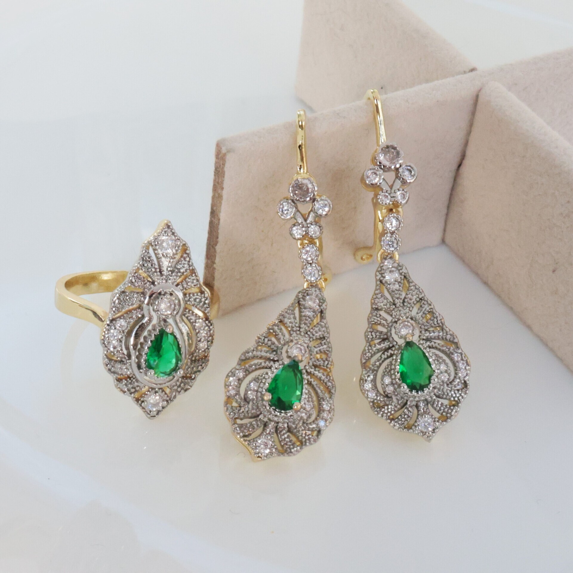 Комплект ювелирной бижутерии Итальянское золото (покрытие желтое 14к), серьги и кольцо 19 р, покрытие позолота и посеребрение, вставка: фианит, цвет: прозрачный и зеленый, арт. 213.067-19