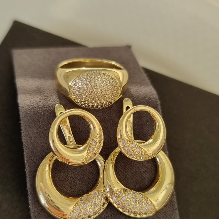 Комплект ювелирной бижутерии Итальянское золото (покрытие желтое 14к), серьги и кольцо в стиле геометрии, вставка: фианиты, р 18, Уценка, арт.08.1963