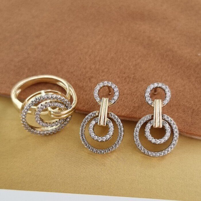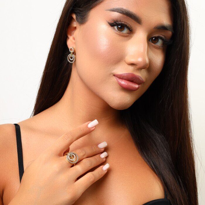 Комплект ювелирной бижутерии Итальянское золото (покрытие желтое 14к), серьги и кольцо, вставка: фианиты, р-р 17, Уценка, арт. 08.2384