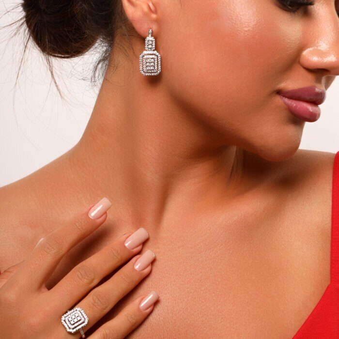 Описание Уценка! В серьге отсутствует один страз.На кольце небольшое, светлое пятно.Размер серьги: 3,3*1,4 см. Замок: английский. Вес комплекта: 13 гр.