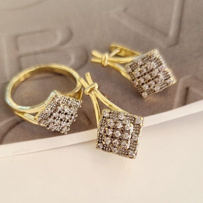 Комплект ювелирной бижутерии Итальянское золото (покрытие желтое 14к), серьги и кольцо, вставка: фианиты, цвет: прозрачный, р-р 18, Уценка, арт. 08.1536