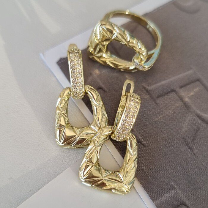 Комплект ювелирной бижутерии Итальянское золото (покрытие желтое 14к), серьги и кольцо, вставка: фианиты, цвет: прозрачный, р-р 20, Уценка, арт. 08.1564