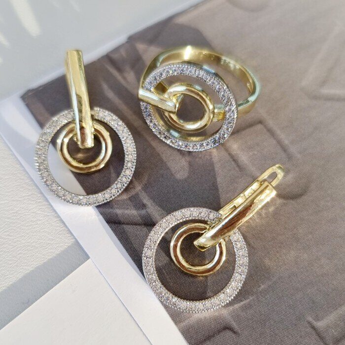 Комплект ювелирной бижутерии Итальянское золото (покрытие желтое 14к), серьги и кольцо, вставка: фианиты, цвет: прозрачный, р-р 18, Уценка, арт. 08.1627