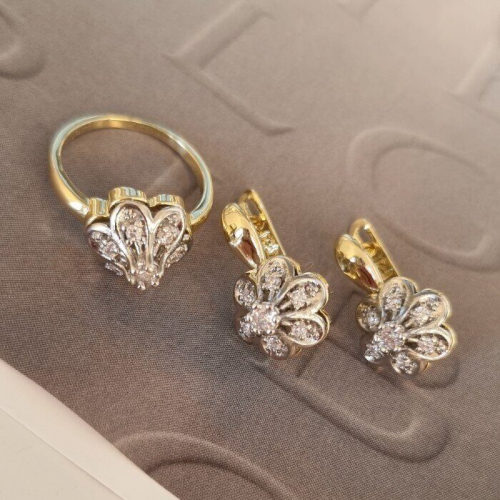 Комплект ювелирной бижутерии Итальянское золото (покрытие желтое 14к), серьги и кольцо, вставка: фианиты, цвет: прозрачный, р-р 19, Уценка, арт. 08.1855