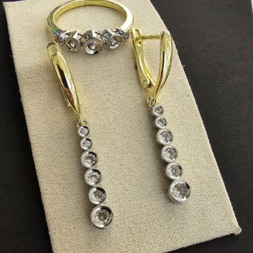 Комплект ювелирной бижутерии Итальянское золото (покрытие желтое 14к), серьги и кольцо, вставка: фианиты, цвет: прозрачный, р-р 19,Уценка, арт. 08.1862
