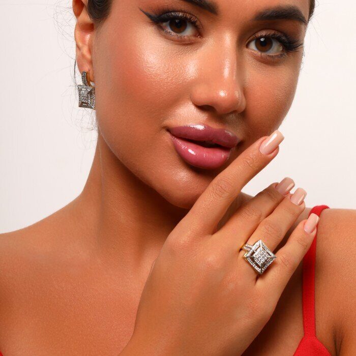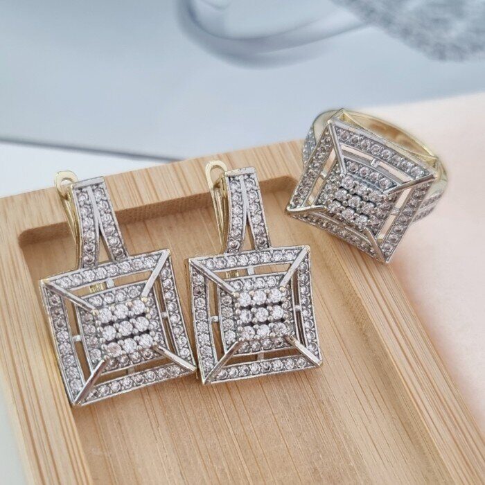 Комплект ювелирной бижутерии Итальянское золото (покрытие желтое 14к), серьги и кольцо, вставка: фианиты, цвет: прозрачный, р-р 19, арт. 216.048-19