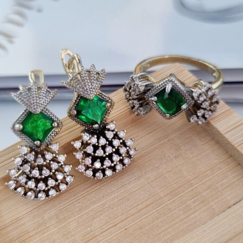 Комплект ювелирной бижутерии Итальянское золото (покрытие желтое 14к), серьги и кольцо, вставка: фианиты, цвет: прозрачный и изумрудный, р-р 18, арт. 216.047-18