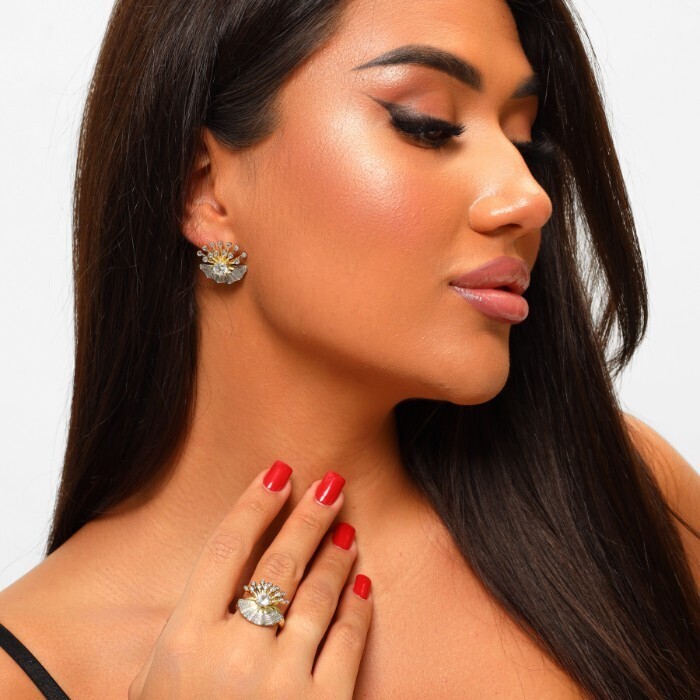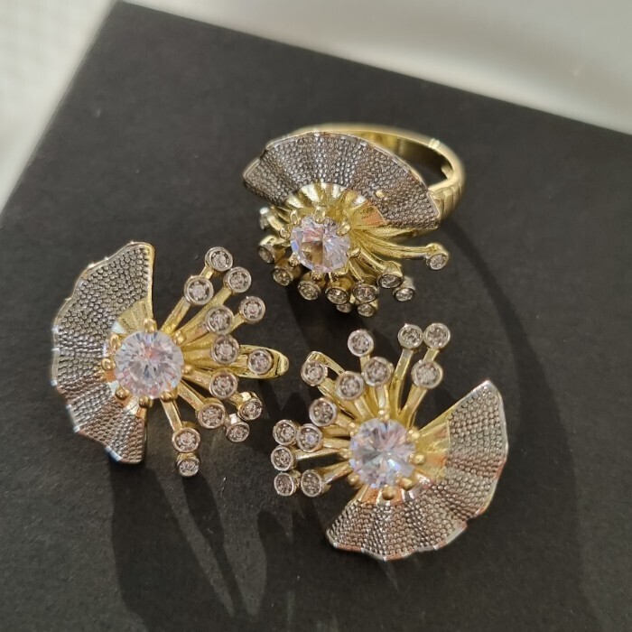 Комплект ювелирной бижутерии Итальянское золото (покрытие желтое 14к), серьги и кольцо, вставка: фианиты, цвет: прозрачный, р-р 19, Уценка, арт.08.2386