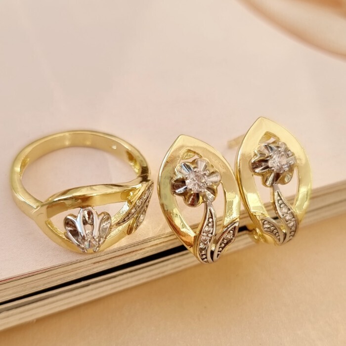 Комплект ювелирной бижутерии Итальянское золото (покрытие желтое 14к), серьги и кольцо, вставка: фианиты, цвет: прозрачный, р-р 17, Уценка, арт.08.2541