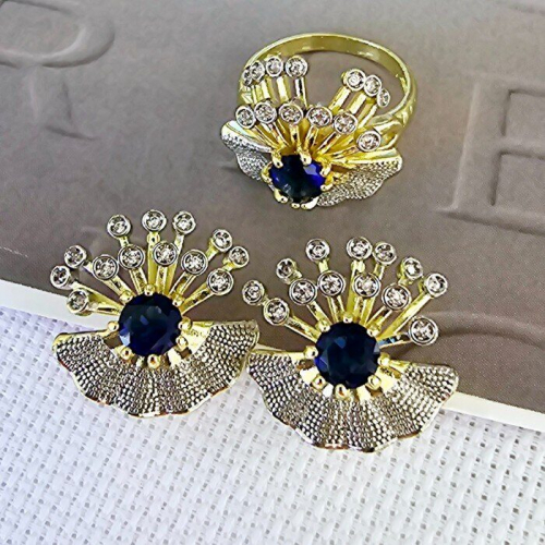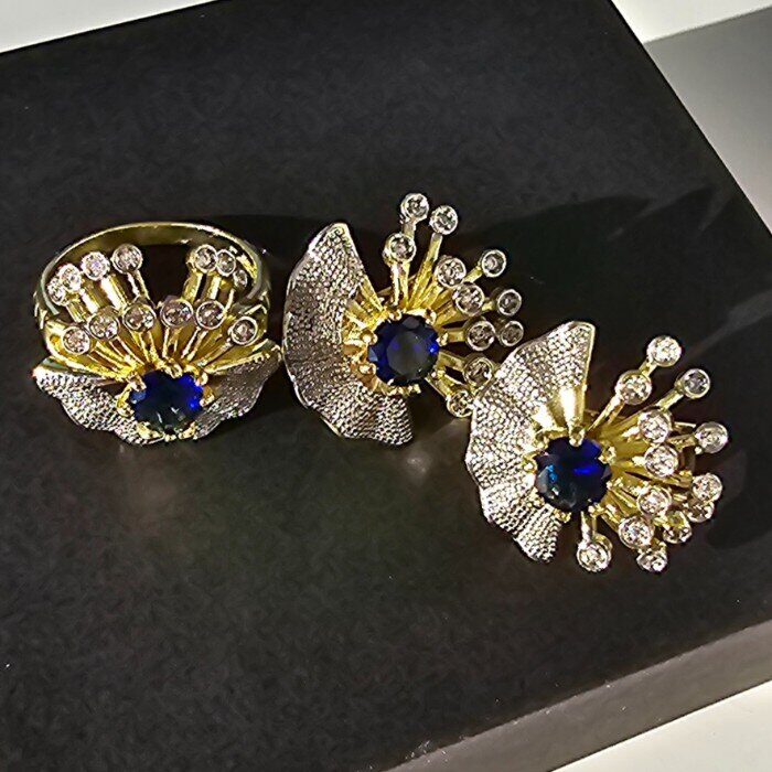 Комплект ювелирной бижутерии Итальянское золото (покрытие желтое 14к), серьги и кольцо, вставка:фианиты, цвет: синий и прозрачный, р-р 19, арт.213.022-19