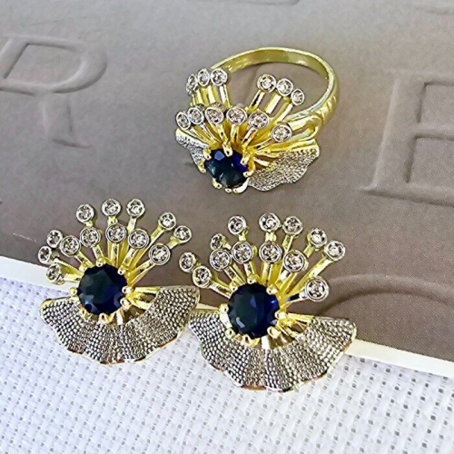 Комплект ювелирной бижутерии Итальянское золото (покрытие желтое 14к), серьги и кольцо, вставка:фианиты, цвет: синий и прозрачный, р-р 18,5, Уценка, арт.08.1978
