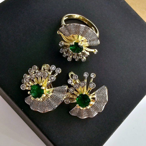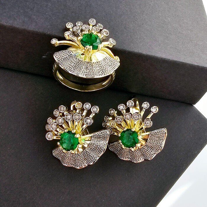 Комплект ювелирной бижутерии Итальянское золото (покрытие желтое 14к), серьги и кольцо, вставка:фианиты, цвет: зеленый и прозрачный, р-р 19, арт.213.021-19