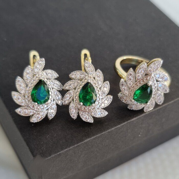 Комплект ювелирной бижутерии Итальянское золото (покрытие желтое 14к), серьги и кольцо, вставка: фианиты, цвет: зеленый и прозрачный, р-р 18, Уценка, арт. 08.2538