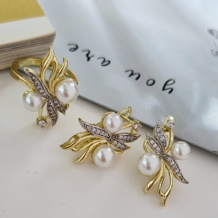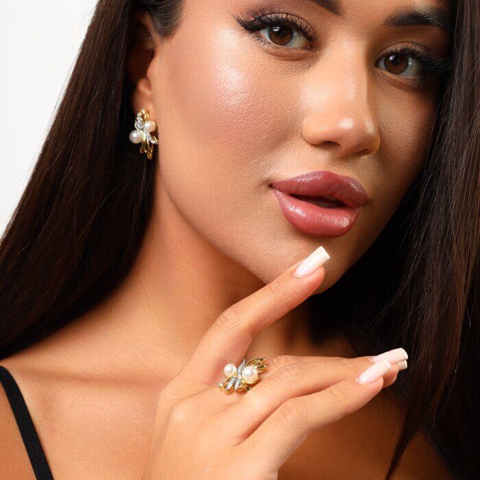 Комплект ювелирной бижутерии Итальянское золото (покрытие желтое 14к), серьги и кольцо, вставка: фианиты и искусственный жемчуг, р-р 20, Уценка, арт.08.1763 ( 217.124-20)