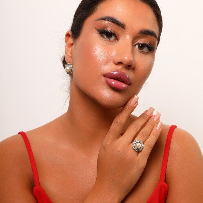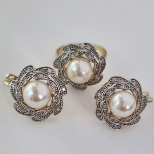 Комплект ювелирной бижутерии Итальянское золото (покрытие желтое 14к), серьги и кольцо, вставка: фианиты и искусственный жемчуг, р-р 18,5, арт. 216.046-18,5