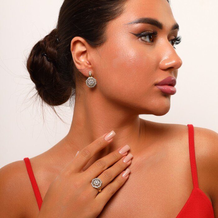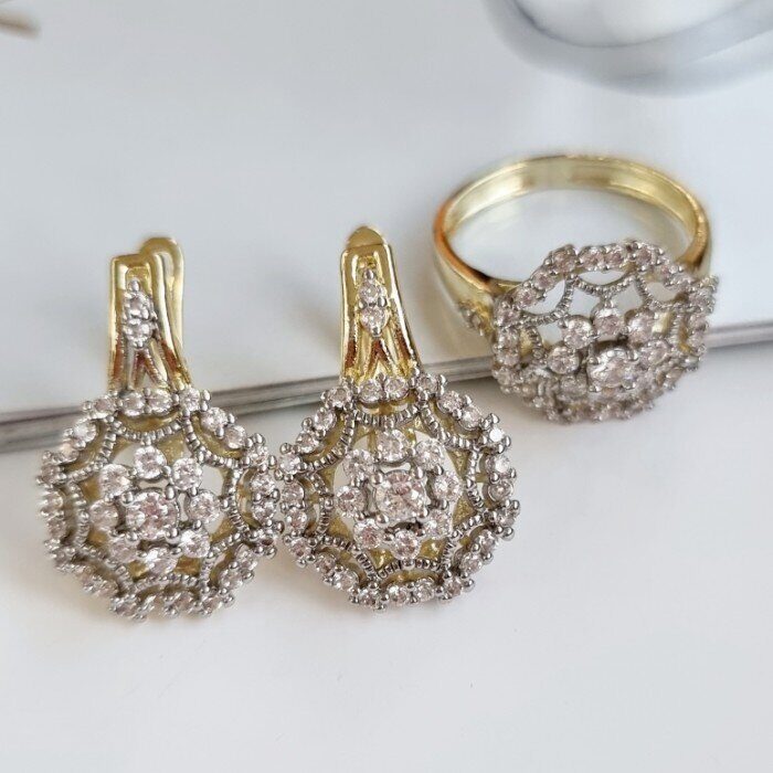 Комплект ювелирной бижутерии Итальянское золото (покрытие желтое 14к), серьги и кольцо, вставка: фианиты, р-р 18, арт. 216.052-18